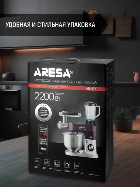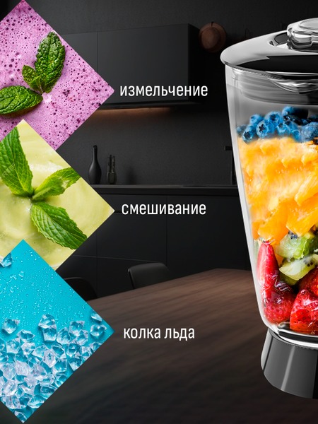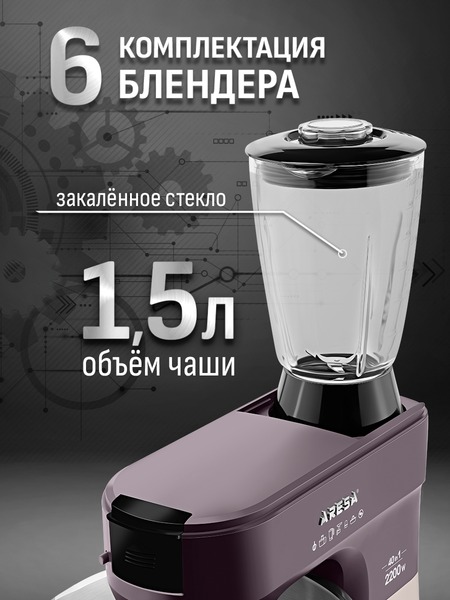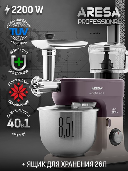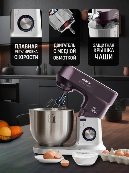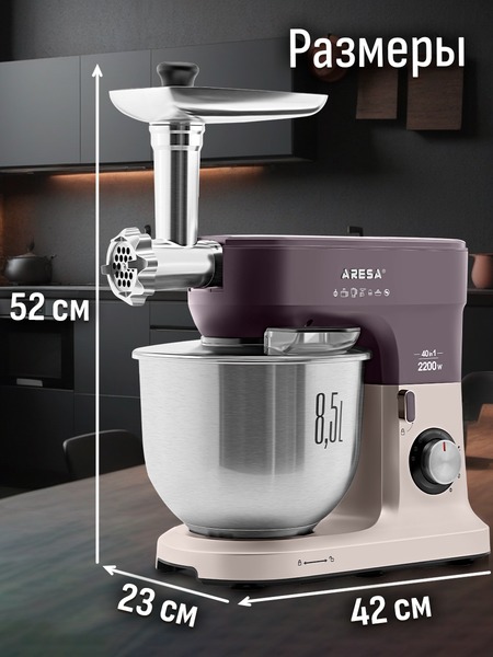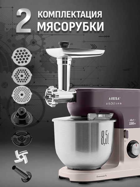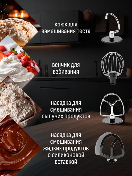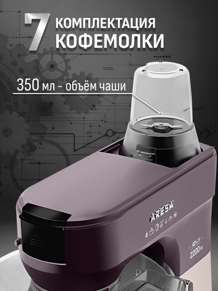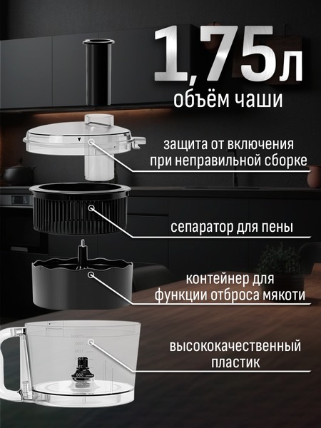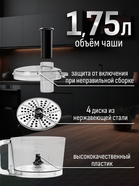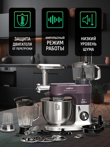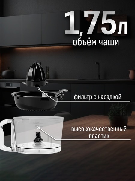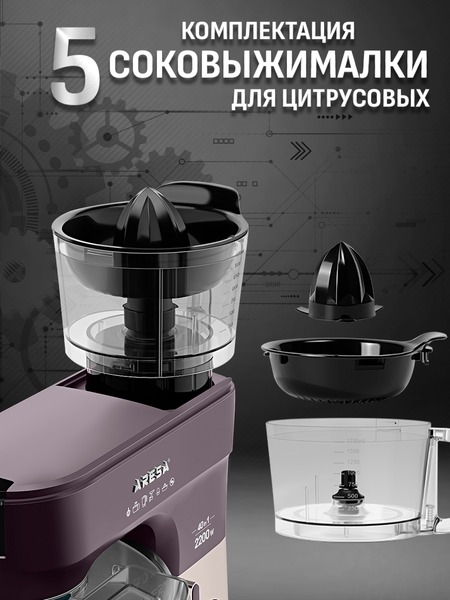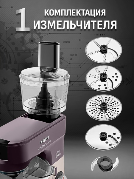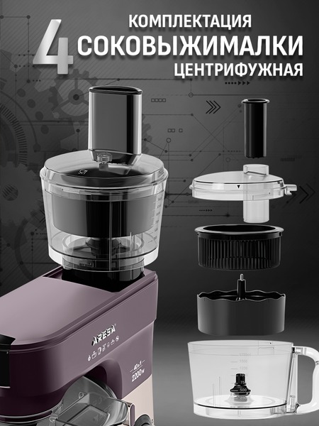 - Функции: миксер, мясорубка, блендер, измельчитель, кофемолка, соковыжималка (цитрусовая, центрифужная), приготовление печенья, макарон (4 формы)