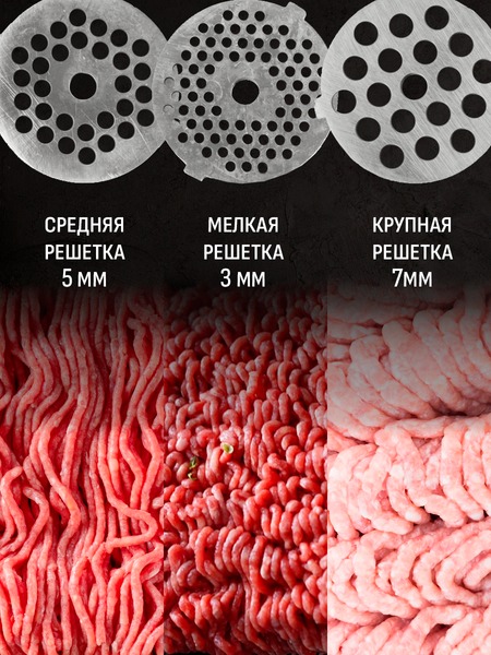 - Решетки для крупного, среднего и мелкого измельчения (7мм, 5мм, 3мм)