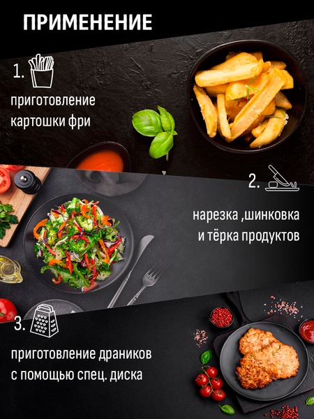 - Диски из нержавеющей стали : 4шт (теркая мелкая, терка крупная, шинковка, картофель фри, диск для драников)